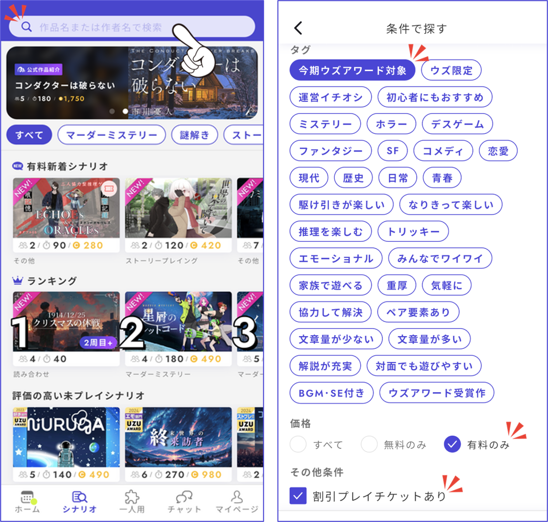 - セールチケットを所有しているシナリオをプレイする際は、チケット使用マークが出ているかどうか確認してからエントリーしましょう。